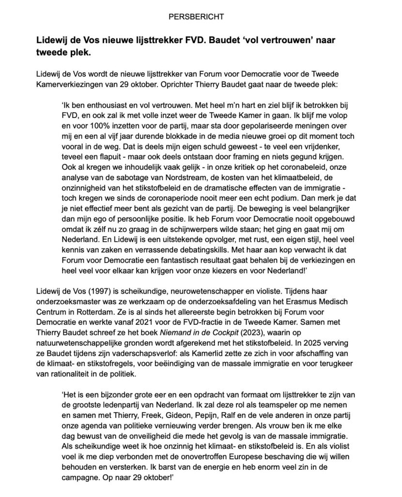 Zo is dit geen afscheid, maar juist een belofte voor de toekomst. Met Lidewij de Vos als lijsttrekker, Thierry Baudet als ervaren parlementariër, en een trouwe achterban die samen blijft bouwen, staat Forum voor Democratie klaar voor een nieuw hoofdstuk. Een hoofdstuk waarin de beweging sterker, opener en toekomstgerichter dan ooit de strijd aangaat – voor vrijheid, voor democratie en voor Nederland.